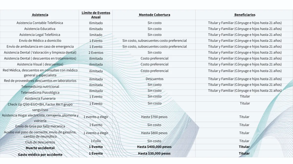 Cubre hasta $400,000 MXN por un solo evento anual en caso de fallecimiento por accidente durante la vigencia del servicio o dentro de los 90 días posteriores. Para el pago se requiere documentación oficial, como acta de defunción y constancia médica. La cobertura es válida hasta los 69 años; a partir de los 70 ya no aplica. Exclusiones principales: accidentes previos al alta, enfermedades, actos dolosos, uso de drogas/alcohol, deportes extremos, actos de guerra, actos delictivos.